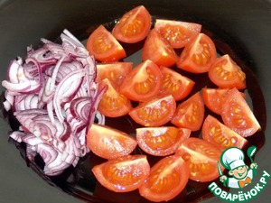 Помидорки разрезать на четвертинки, лук полукольцами.