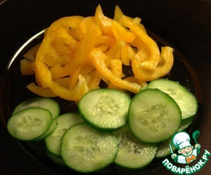 Огурец нарезать кружочками, перец соломкой.