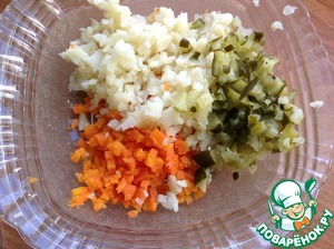 Картофель, морковь и огурцы мелко нарезать кубиками