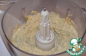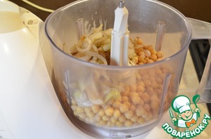 Обжаренный лук с чесноком и нут необходио поместить в чашу блендера. Посолить.