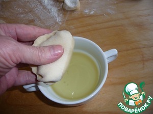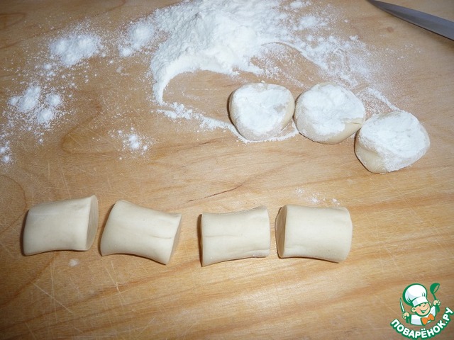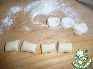 От теста отрезаем небольшой кусок, растягиваем в жгут, нарезаем небольшими кусочками.