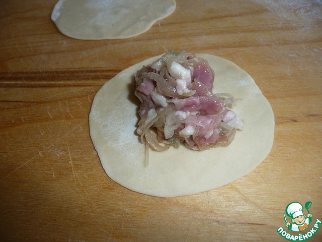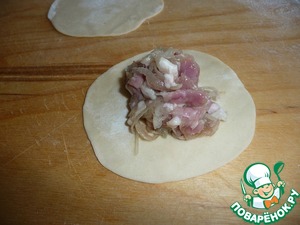 На лепешку выложить мясо. Перед защипыванием тесто немного растянуть.