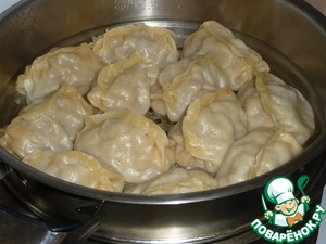 Воду вскипятить и варить манты 35 мин. при сильном кипянии. По готовности отключить мантницу, не открывать крышку еще 5 мин. Затем открыть, дать пару осесть, чистым полотенцем помахать, чтобы выдуть весь пар.