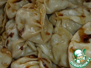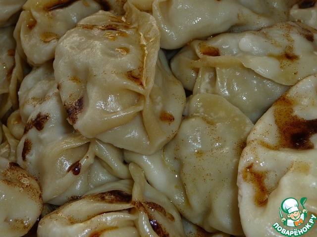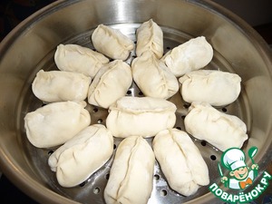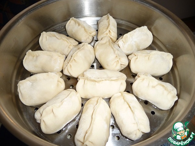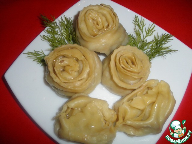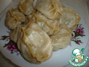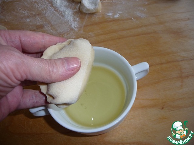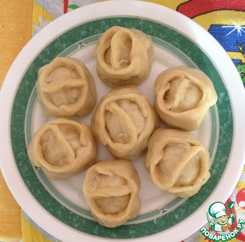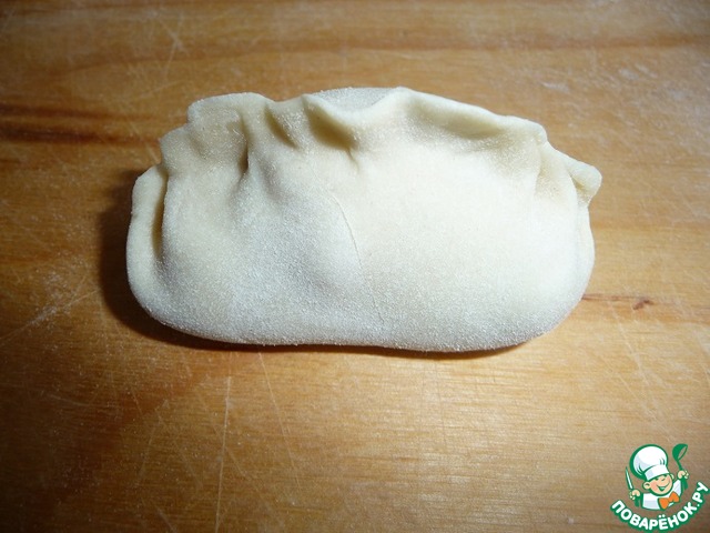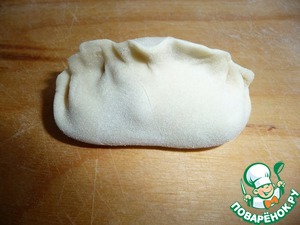 Защипать края. Форму мант можно делать различную. Я склеиваю центр, бока завожу к центру и защип. Получается как пирожок.
