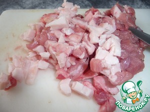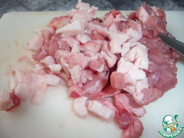 Мясо мелко порезать. Оно режется лучше, если немного охладить. (Размер мяса - примерно ноготок мизинца). С мяса убрать жилки и крупные пленки.