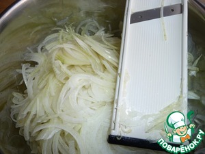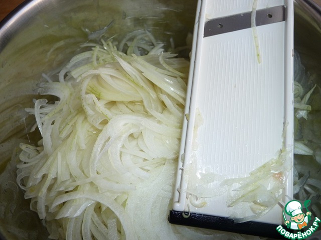 Лук порезать кольцами или полукольцами. У меня специальная терка для лука.
