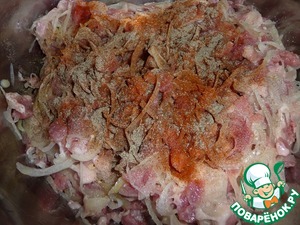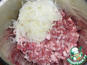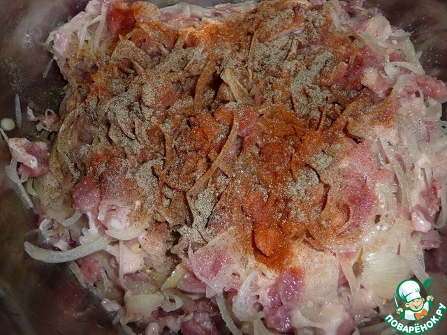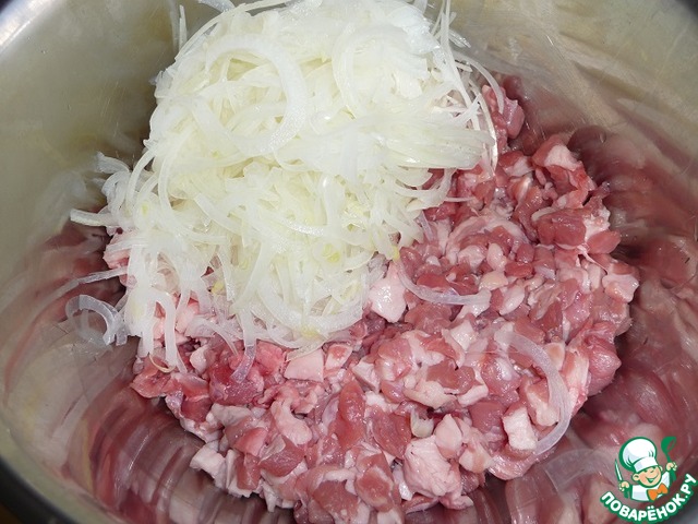 Лук хорошо перемешать, соль, перец по вкусу. Пусть перемешанный фарш постоит, подмаринуется.