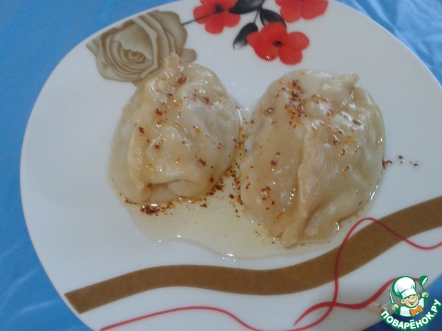 Пусть манты чуть-чуть обсохнут, тогда их будет легче снять и не порвать при этом. Вынуть на большое блюдо. Можно полить смесью растительное масло с красным перцем. Масло хорошо разогреть, но не кипятить, добавить 1 ч. л. красного перца.