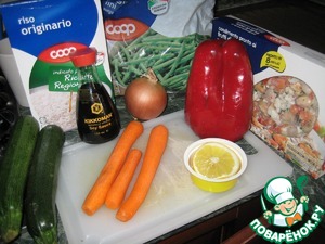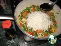 Буквально через 2 минутки добавляем промытый рис, мне нравится с круглым рисом, но можно использовать любой другой, 1 столовую ложку соевого соуса Kikkoman, соль по вкусу и немного лимонного сока, все перемешать, потушить 2 минутки и залить 3 стаканами холодной воды. Накрыть крышкой и тушить до готовности риса, пока вся вода не впитается