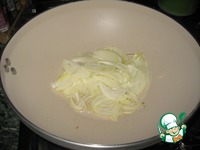 Лук нарезать вдоль полукольцами и положить в вок с подогретым оливковым маслом (можно использовать обычную сковороду или казан), немного потушить