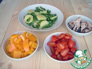Салат, если необходимо, помыть и порезать крупными кусочками, я же покупаю готовый, не требующий мытья. Помидоры черри разрезаю на половинки, перец - кусочками среднего размера. Картофель, нарезанный дольками и фасоль отвариваю вместе в течение 7-8 минут до мягкости. Откидываю на дуршлаг.