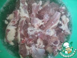 • 2) Каре ягненка положить в большую глубокую тарелку и залить двумя бутылками минеральной воды. Оставить часа на 2 мариноваться.