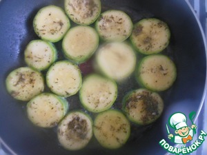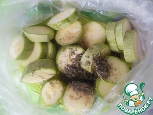 • 4) Нарезанные кабачки сложить в полиэтиленовый пакет, туда же добавить специи: майоран, тимьян, базилик, щепотка соли, сок половины лимона и оливковое масло. Завязать пакет и бить об стол 1 минуту. Затем оставить полежать минут 15.