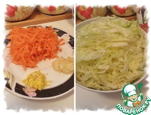Выдавить чеснок, имбирь натереть на мелкой тёрке, морковь натереть на крупной тёрке, капусту порезать тоненькой соломкой.