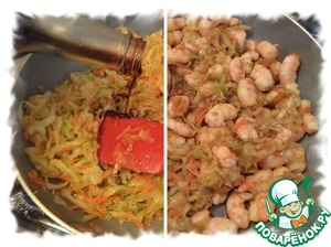 Когда капуста станет мягкой добавить соевый соуc, перемешать и затем креветки.