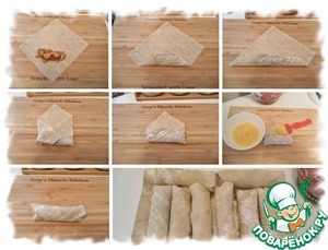 Выкладываем лист теста уголком к себе, немного отступая от края кладём начинку (примерно 2 ч. л.).