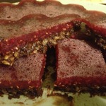 В форму с подготовленной основой вылить остывшее до 60-70 С градусов вишневое пюре, охладить и отправить в холодильник до дальнейшего застывания. Вынуть из формы десерт, нарезать квадратами или прямоугольниками, подавать к столу.
