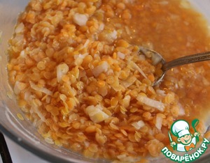 Сварить чечевицу по инструкции на упаковке (1:2, варить 10 минут) с добавлением мелко нарезанной луковицы и почти до полного выпаривания воды. Чуть подсолить.