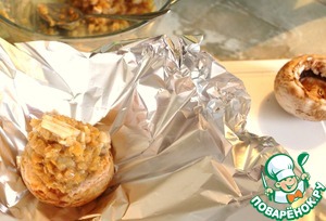 Шампиньоны смазать соевым соусом (или просто посолить и поперчить), начинить чечевицей.