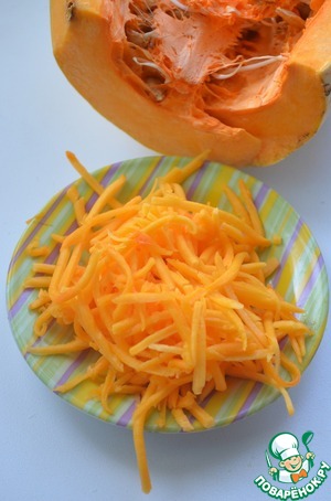 Тыкву очистите от кожуры и семян, натрите на крупной терке или терке для корейских блюд.