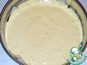 В разъёмную форму 26 см положить пергаментную бумагу, бортики смазать подсолнечным маслом и вылить тесто для выпекания.