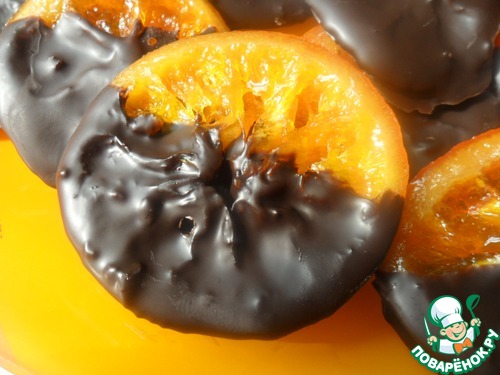 Апельсиновые кружки окунуть до половины в растопленный шоколад, уложить на пекарскую бумагу до застывания шоколада при комнатной температуре.
