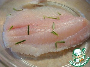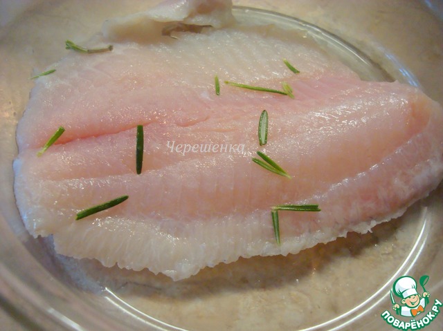 Филе рыбы посолить, приправить молотым белым перцем, сбрызнуть соком лимона, переложить иголочками розмарина, накрыть крышкой и отставить в сторону мариноваться.