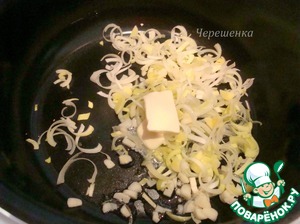 Положить в чашу МВ сливочное и растительное маслА. Обжарить лук и чеснок в течение 3 минут.