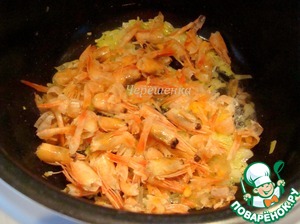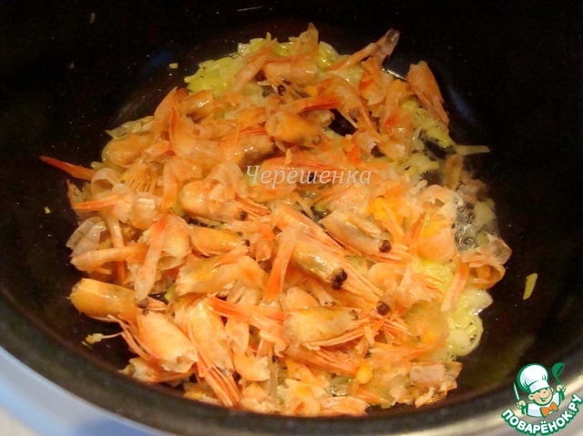 Добавить головы и панцири креветок. Обжарить 5 минут.
