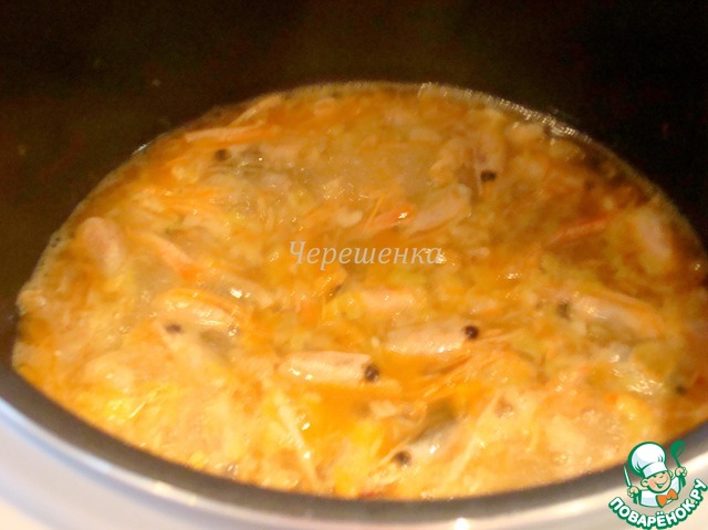Добавить 300 мл рыбного бульона (можно овощного или просто воды). Тушить 15 минут.