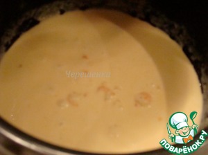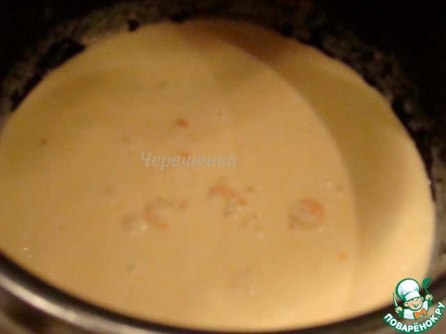 В холодных сливках растворить крахмал (муку) и вылить смесь в чашу МВ, добавить молотый розовый перец. Тушить оставшиеся 7 минут. За 2 минуты до окончания приготовления добавить креветки. Посолить по вкусу.