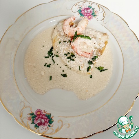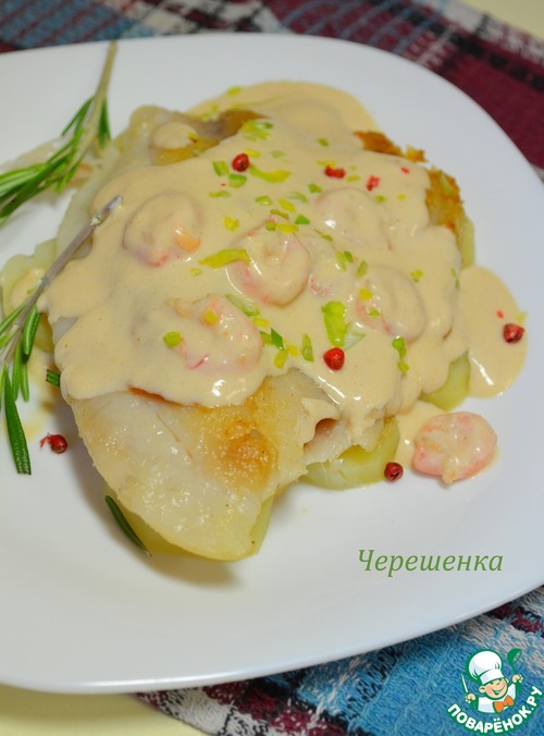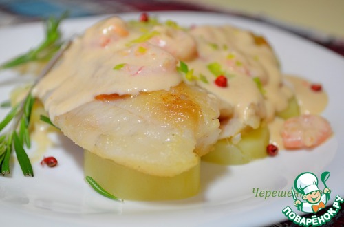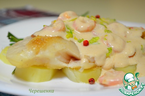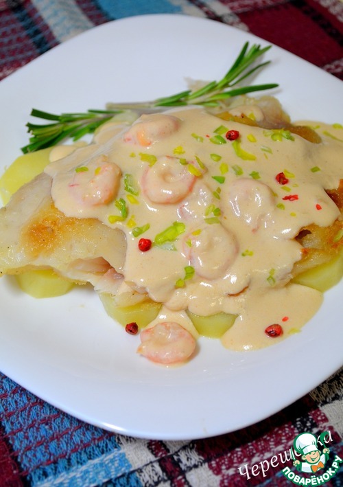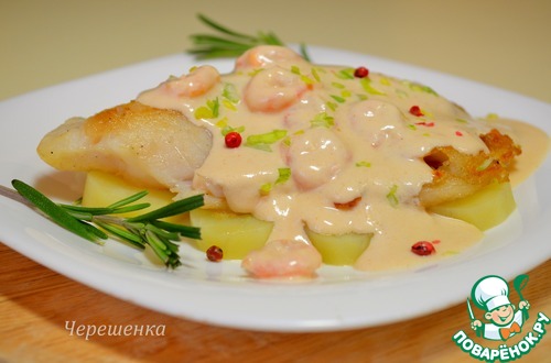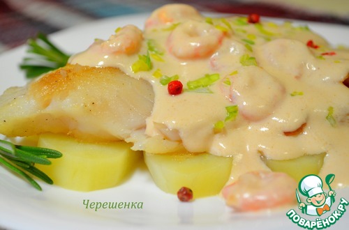 Рецепт «Белая рыба с розовым соусом и креветками»: