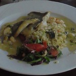 Белая рыба с розовым соусом и креветками