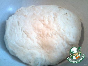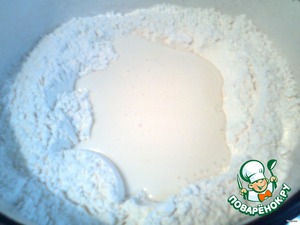 Сделать углубление и понемногу добавлять кислое молоко, чтобы тесто было мягким, посолить.