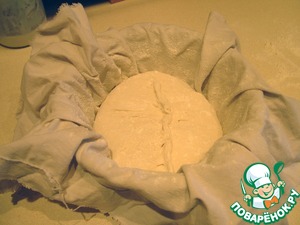 Расстаиваем в расстоечной корзине или сразу на противне, выстеленном бумагой (накрыв большой миской). Расстойка в теплом (30*С) месте до увеличения в 2,5 раза (у меня примерно 2,5-3 часа).