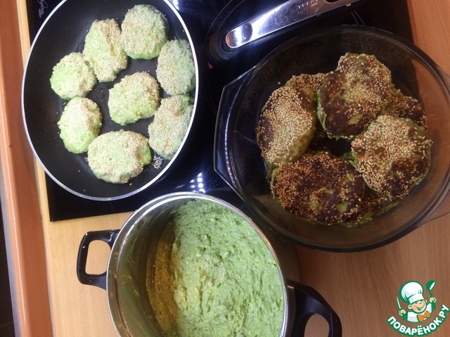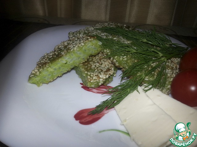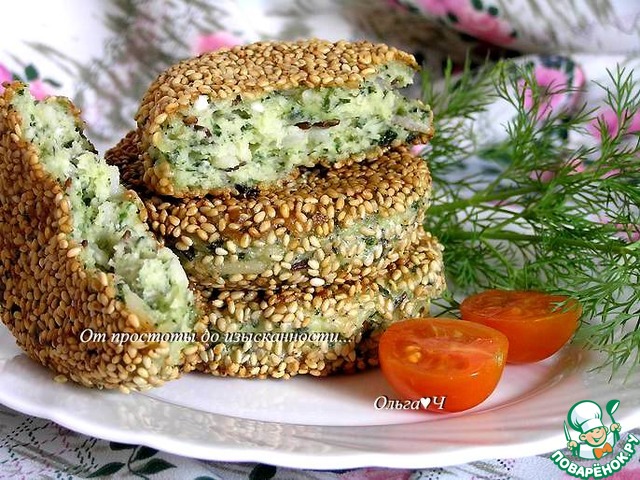 Формируем вареники, обваливаем их в кунжуте и обжариваем на сковороде до золотистой корочки. К рисовым сырники со шпинатом хорошо подойдет плавленый сыр и помидорки черри.