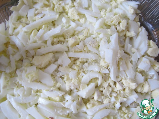 Яйца нарезать соломкой (либо натереть на крупной терке).