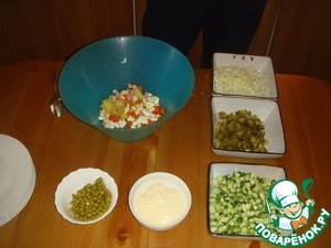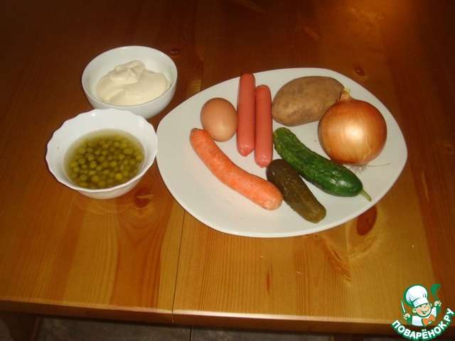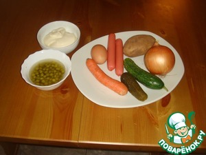• Что мы имеем? свежий и солёный огурчик уже порезаны в прочем как порезан лук и сосиски. Осталось только таким же образом почистить и нарезать сваренные картофель, морковку и яйца. Чем мы и занимаемся.