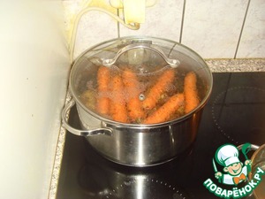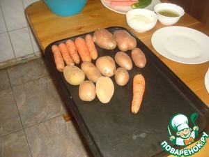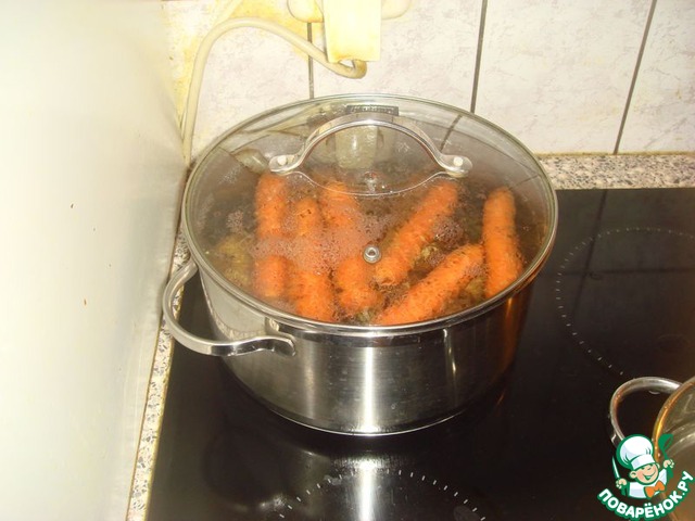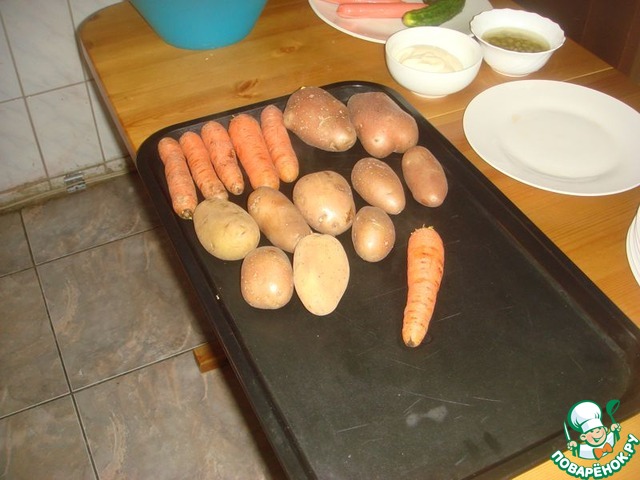 • Моём картофель, и морковку кладём в кастрюлю, заливаем холодной водой и ставим на плиту варится. Перед Варкой не надо чистить овощи, они должны вариться в кожуре. 20-30 минут. Готовность определяется путем протыкания острым ножом, если нож легко протыкает овощи, значит они сварились. Морковка вариться дольше картошки, поэтому обязательно проверьте легко ли протыкается ножом морковка, чтобы не оказалось, что картошка сварилась, а морковь нет.