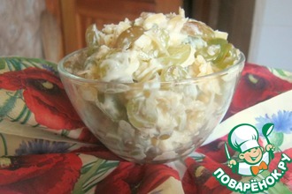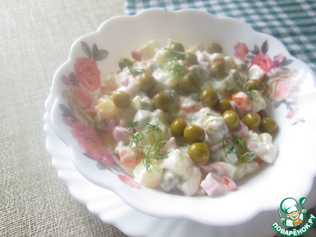 • Осталось только смешать все ингредиенты вместе, засыпать зелёный горошек и заправить салат майонезом. Всё салат готов.