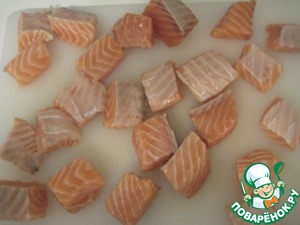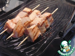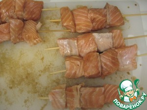 По 4 кусочка семги нанизать на шпажки, сбрызнуть оливковым маслом и соевым соусом, посолить немного, так как соус уже соленый, и поперчить.