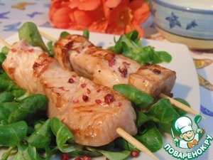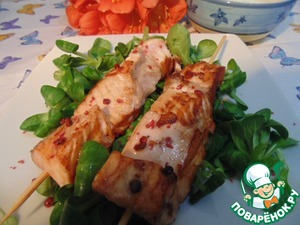 Горячие шпажки выложить на валериану, подавать с соусом.