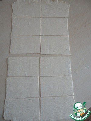 Тесто разморозить. Тонко раскатать (не более 2 мм) и разделить на 12 прямоугольников.