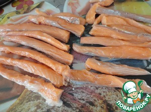 Филе (лучше всего брать хвосты, т. к. там нет костей, и разделать на филе), рыбы нарезать вдоль. И разрезать ещё раз пополам.