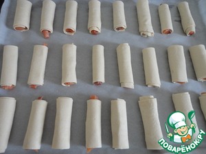 На меньшую часть прямоугольника выложить кусочки филе (можно присолить рыбку). Свернуть рулетиками, край теста смазать белком.