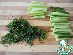 В это время огурцы и сельдерей нарезать тонкой соломкой, укроп измельчить.