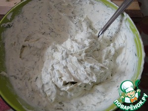 Творожный сыр выложить в удобную емкость и размять вилкой. Добавить сливки, соль по вкусу, измельчённый укроп, всё хорошо перемешать.