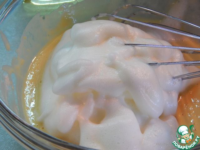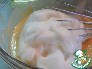 Отдельно взбиваем белки яиц до мягких пиков. Аккуратно вмешиваем в тесто.