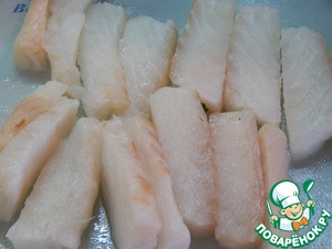 Рыбу нарезаем брусочками вдоль волокон (это важно, если поперек- она будет рассыпаться)