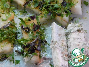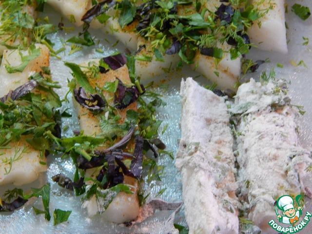 Рыбу посыпаем солью, специями, обваливаем в зелени, затем в муке.